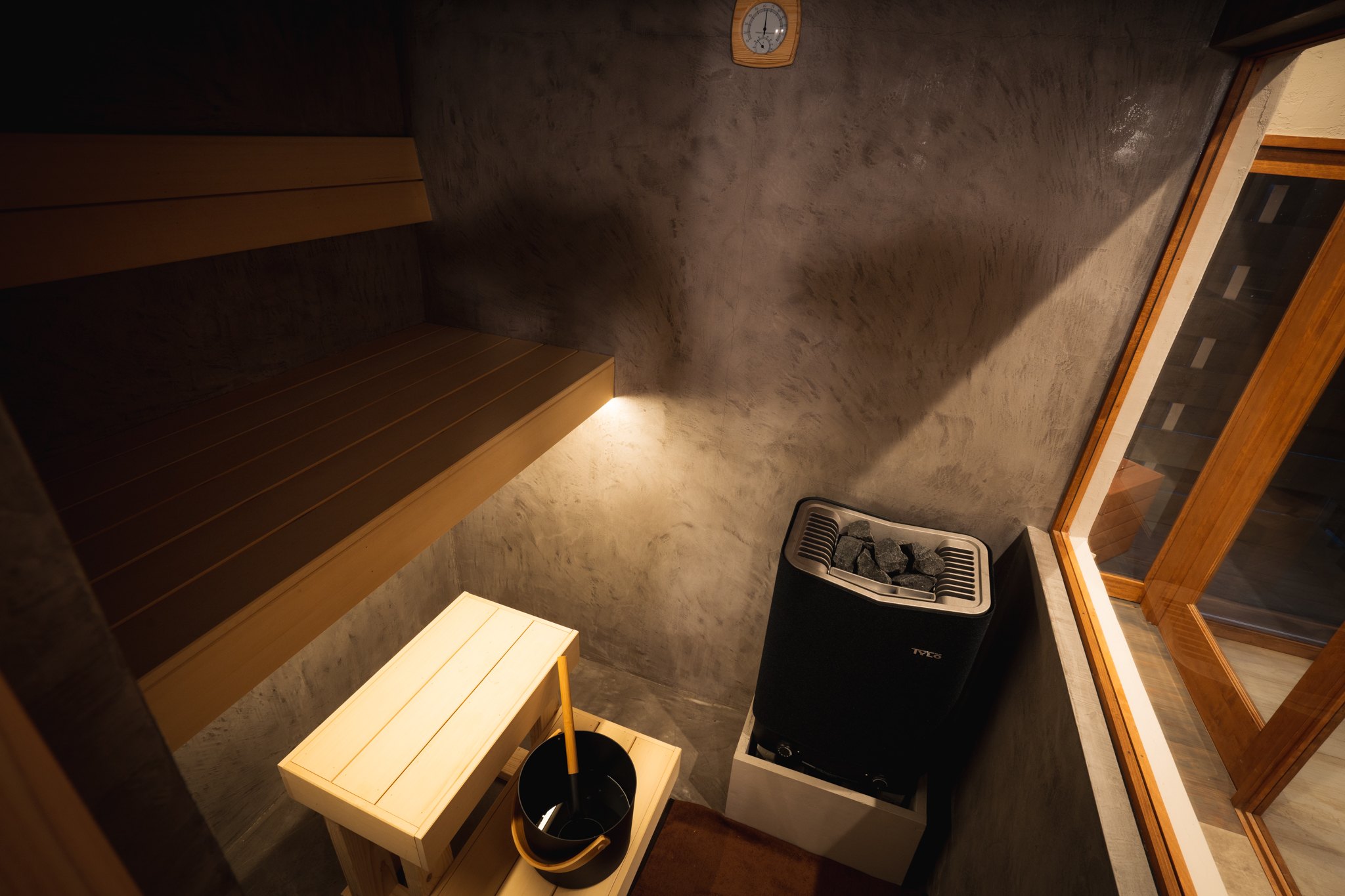あえて和室のまま残した寝室また、この企画の検討時期には、別プロジェクトであるサウナランド浅草がすでにオープンしており、サウナ付き客室の高い稼働率と高単価の実現が確認できていました。この成功例を踏まえ、合い宿すみよしにもサウナを新設し、サウナでリフレッシュした後にみんなで食事を楽しみ、そのまま宿泊できるという体験を、展開することにしました。